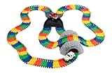 Watch out for collisions on X-track! Race over the mountain & through the tunnel! Over 11 feet of interchangeable flexible track! Requires 2 AA batteries, not inluded.
